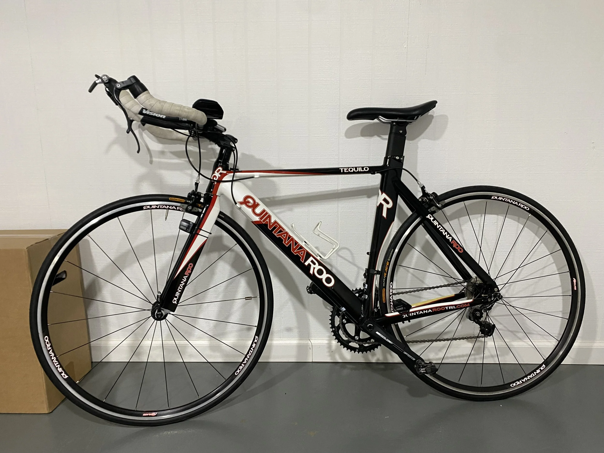 I have done a few sprint tris as a kid, but refused to do more because they involved running. Duh. But since I picked up running more seriously this year, I was only missing a bike to complete the trifecta. After doing some research, I got my hands on a gently used Quintana Roo tri bike. The scary part wasn't that I hadn't really ridden in a few years, it was the fact that it had clip-in pedals. The thought of attaching my only fall-prevention mechanism to the bike seemed like a terrifying concept (and still is...). Nevertheless, I got myself some proper shoes and the right pedals so that I can begin practicing clipping in and out. Even though I have had the bike for a little while now, I struggled to understand the pedal/shoe compatibility so I am just now getting the right equipment. Turns out, every hobby has its intricacies. Here is my bike!