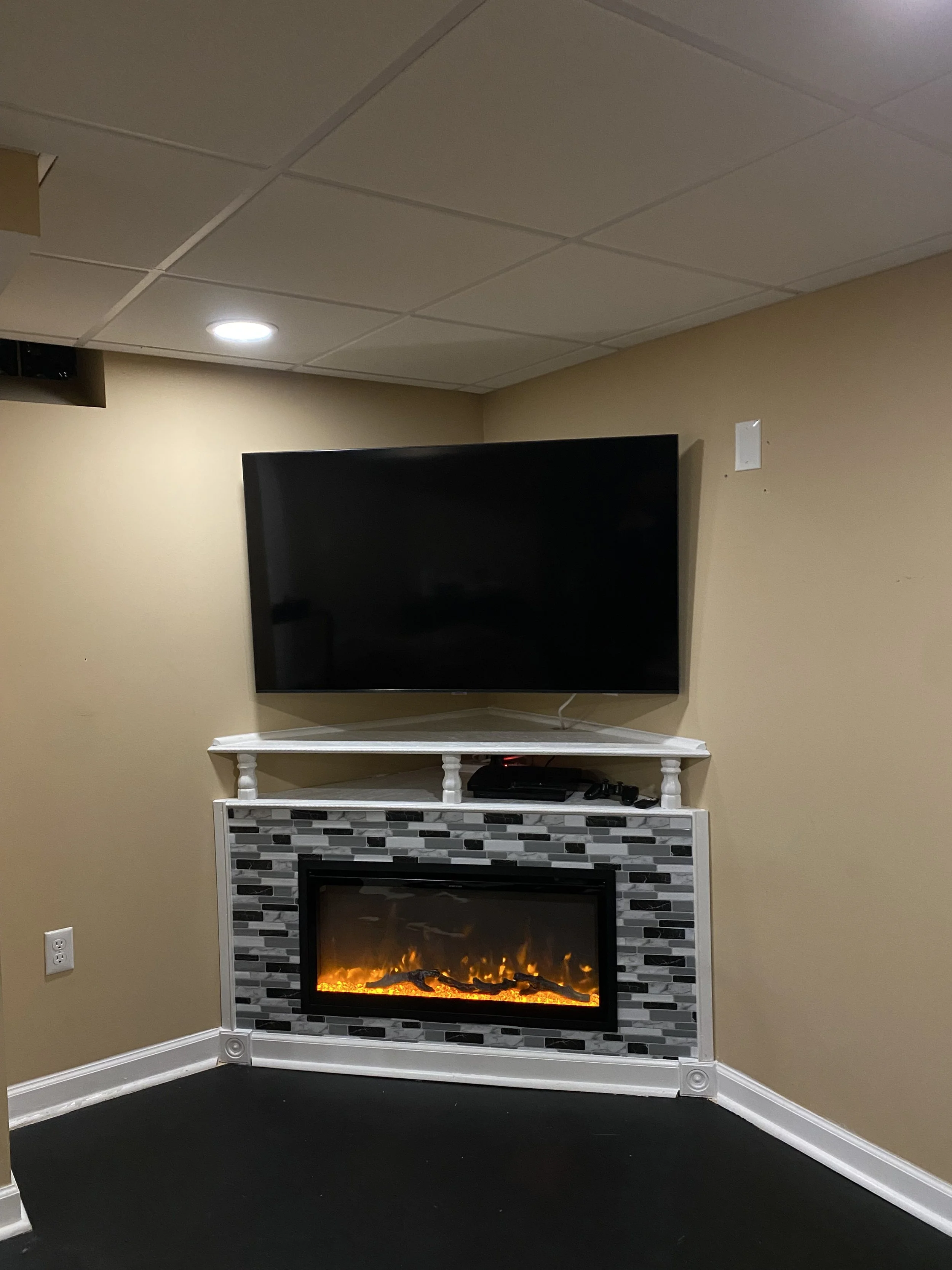 In more miscellaneous news, but still fun nonetheless, my dad and I (well mostly him) built a fireplace box for my electric fireplace! It looks great in my basement corner and really gives the space more purpose and interest. Take a look!